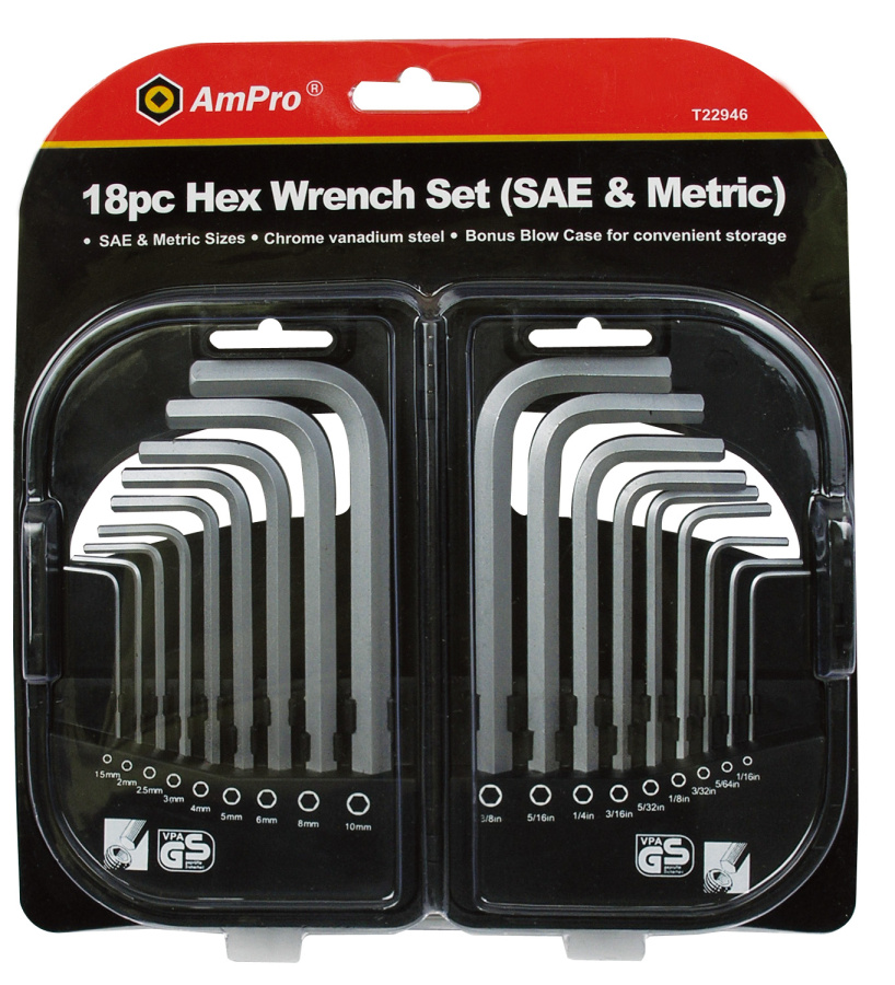 Приобрести T22946 Набор шестигранников Г-образных 18 предметов (1/16"-3/8"; М1,5-М10) от компании AmPro (Тайвань) из раздела Шестигранники