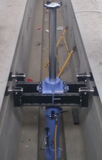 Передвигается по направляющим вдоль окантовки верха ямы (уголок, швеллер).